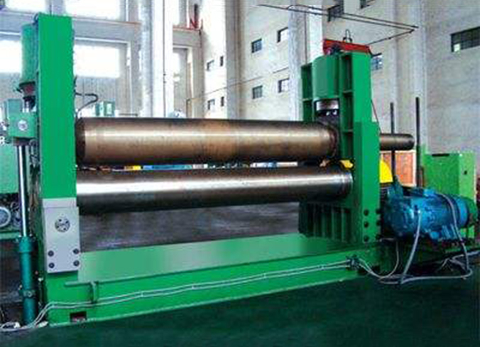 本機結(jié)構(gòu)型式為三錕對稱式,上輥在兩下輥中央對稱位置作垂直升降運動,通過液壓缸內(nèi)的液壓油作用于活塞而獲得,為液壓傳動;兩下作旋轉(zhuǎn)運動,通過減速機的輸出齒輪與下輥齒輪嚙合為卷制板材提供扭矩。本機床結(jié)構(gòu)緊,操作維修方便。